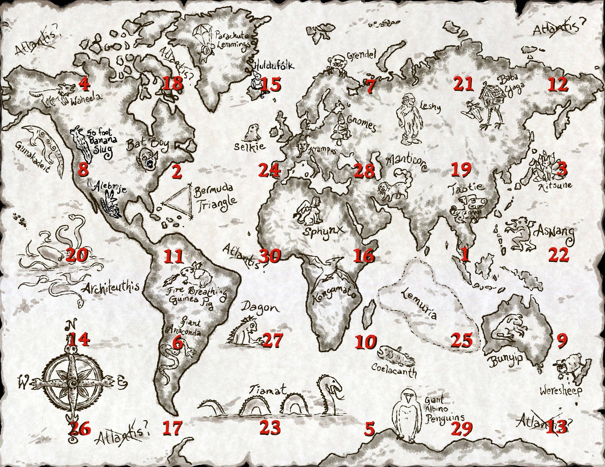 Even February because you get bonus days - what a deal. We used the same advanced advent calendar technology as our popular Krampus BADvent calendar to create this interactive paper masterpiece but this one comes with 30 days of surprises behind each door! Search the known world for a different crazy cryptid every day for a month. As you open each door, you can flip the calendar to the back to learn more about what fascinating creature you've just discovered and where in the world it might be found. Emphasis on the word "might." Are these creatures real? Sure, why not? Are they merely the stuff of myth and legend? Who's to say? Are they super fun to discover and learn about. ABSO-freaking-LUTELY! This calendar is more cutely creepy than scary creepy, so it's appropriate for weird kids and weird adults alike.