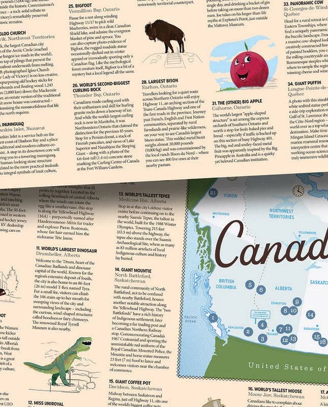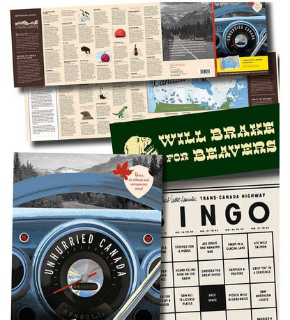 Unhurried Canada: A Guide to Roadside Attractions is a fold-out map inviting readers to rediscover the joys of slow travel. It celebrates the long-forgotten road trip, where the journey itself is an experience to be savoured, rather than just a means to reach a destination. Across Canada's vast landscapes, from the Pacific shores to the eastern seaboard, this guide highlights monumental and endearing attractions that dot the country's highways and byways.